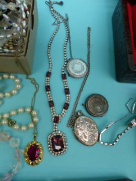 A collection of costume jewellery including three silver lockets, silver watch etc