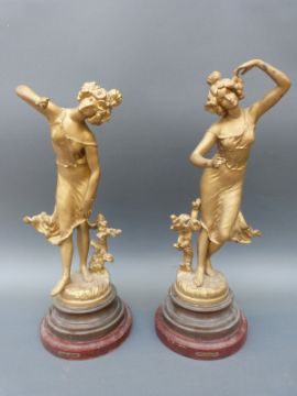 A pair of large spelter figures on marble bases Coquette and Surprise, height 56cm