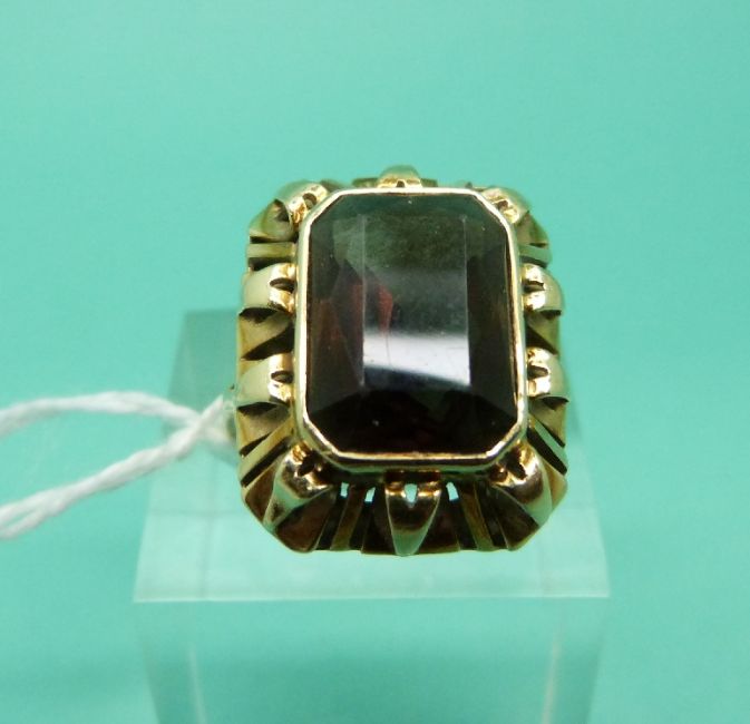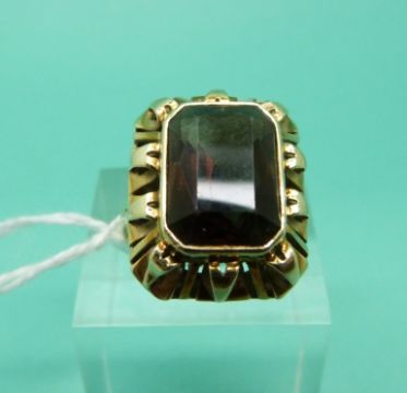 A yellow metal ring marked 585 set with a smoky quartz, weight 6.1g (Size N)