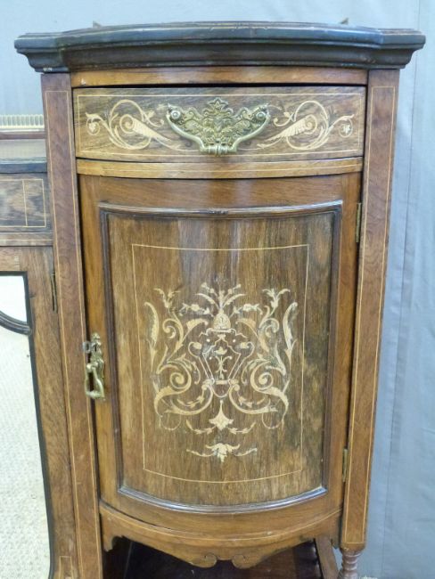 A 19thC rosewood chiffonier with central bevelled mirror doors flanked by barrel fronted drawer, cupboard and galleried shelf W152 x D48 x H108cm