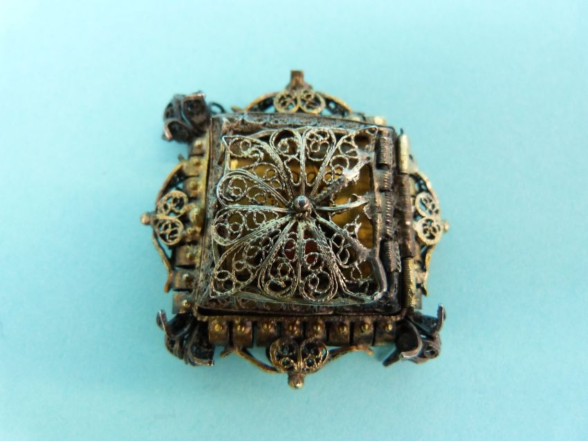 A white metal filigree pendant set with an Indian miniature and a white metal filigree icon
