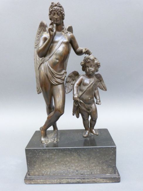 A bronze figural group of a winged god with putti, height 49cm