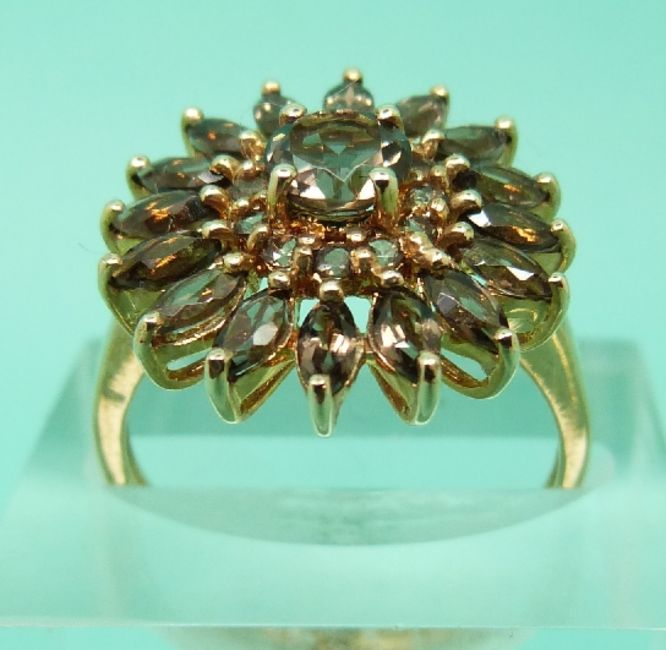 Three 9ct gold rings, two set with morganite and another with quartz