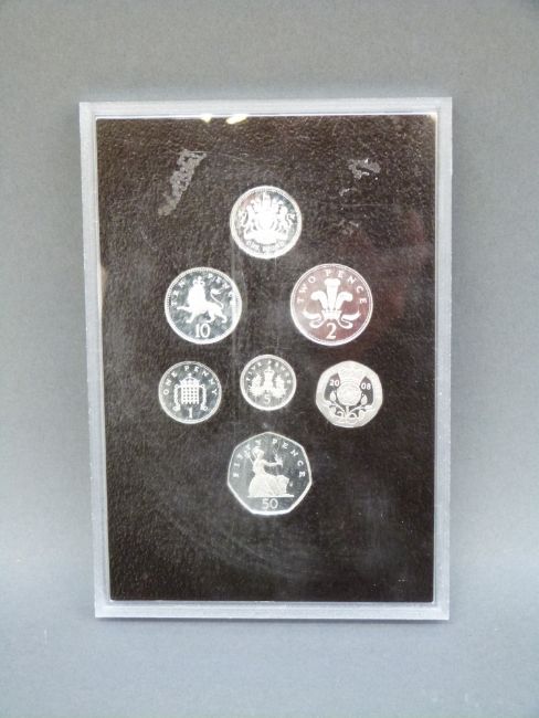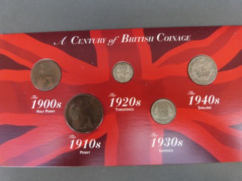 Three UK brilliant uncirculated coin sets 2008 comprising old reverse and Royal Shield of Arms examples in silver (no certificates) and a base metal example, together with a "Century of British Coinage" set and a 2006 crown