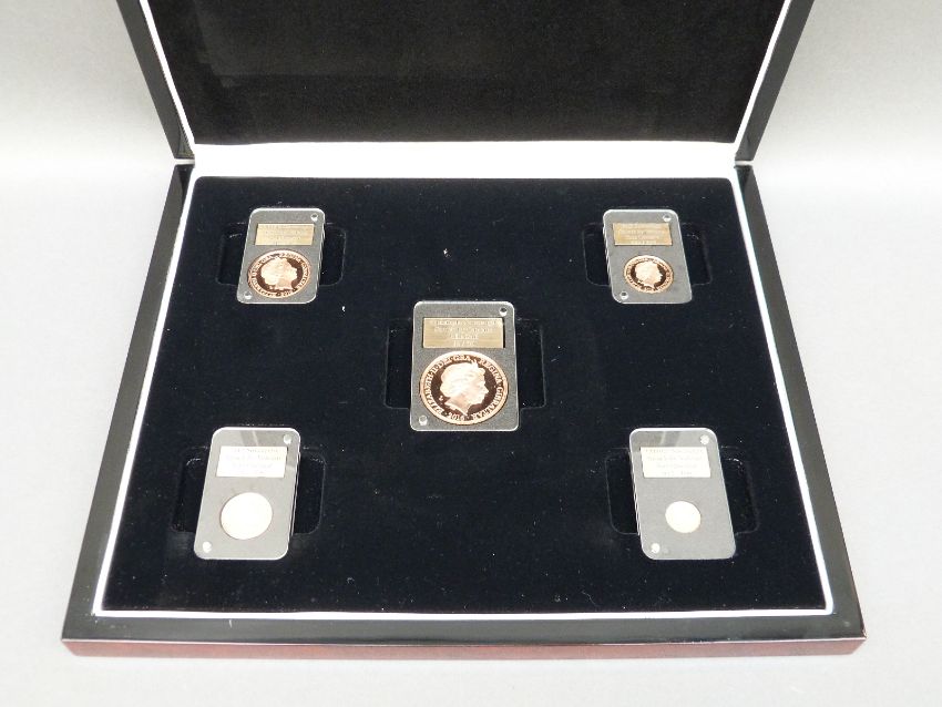 The Battle of the Atlantic limited edition gold sovereign set including a quintuple sovereign with certificates, photographs, facsimile log book etc, in deluxe case by the London Mint Office
