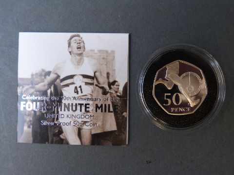 Five cased and certificated silver proof 50 pence coins to include 'Women's Social and Political Union', Four Minute Mile etc.