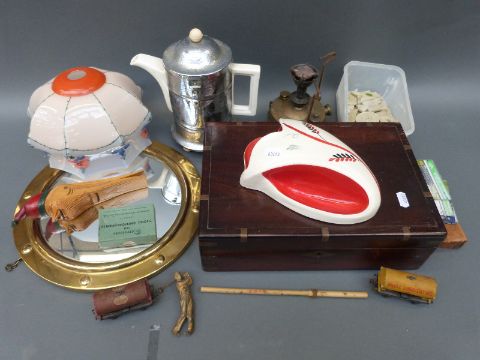 A retro Burleigh ware wall pocket, painted glass lamp shade, stove, retro teapot, mirror, oriental carved item, fossils etc