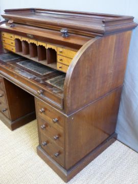 A 19thC mahogany cylinder bureau, opening to reveal birds eye maple fitted interior and slide out writing surface and two pedestals of three drawers below, W121 x D66 x H112cm