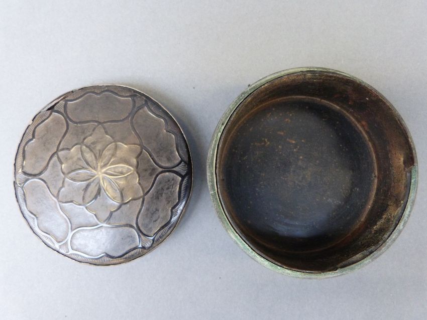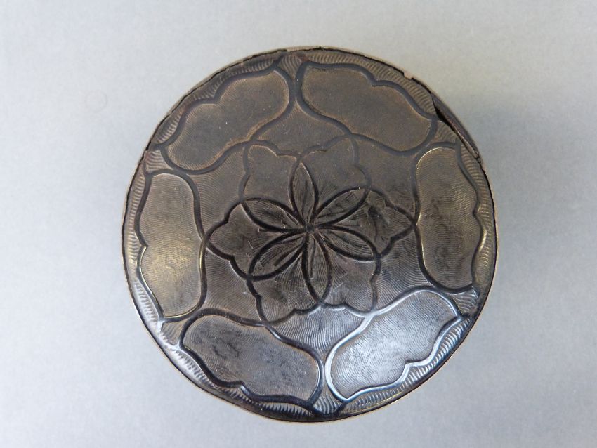 A 19thC carved horn snuff box with white metal collar, diameter 8cm