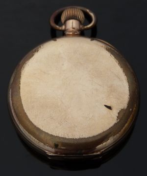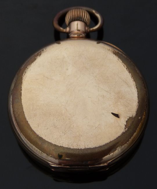 A gold plated full hunter keyless winding pocket watch with subsidiary seconds dial, Roman numerals and blued hands, case diameter 50mm.