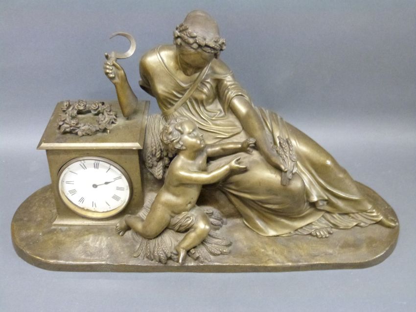 A late 19th century bronze figural mantel timepiece in the form of an Romanesque female figure with sickle and wheat sheaf overlooking a putto, enamel Roman dial, overall width 52cm