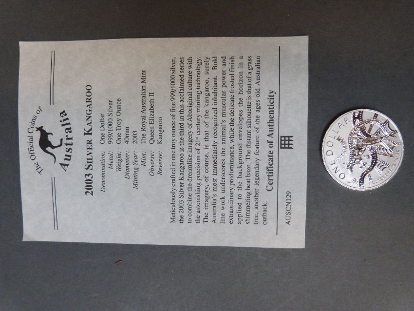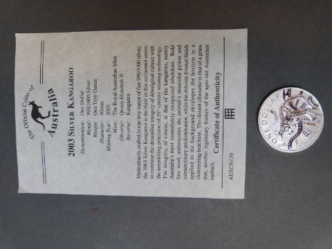 Two silver kangaroo dollars, comprising 2000 and 2003, together with a 2002 kangaroo gold nugget 'smallest gold coins of the world collection' 1.57g with certificates