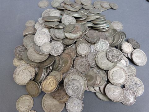 Approximately 2.05kg of pre 1947 silver, includes a few pre 1920 examples and a Victorian shilling, together with a small quantity of sundry coins