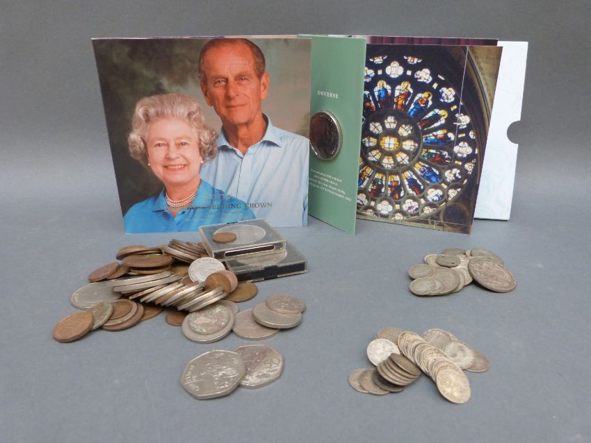 A collection of UK coinage Victorian onwards to include 52g of pre 1920 and 91.8g of pre 1947, includes silver 3d pieces. Together with commemorative crowns and a Battle of Britain and Isle of Man Christmas 50 pence