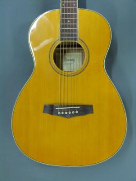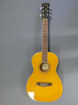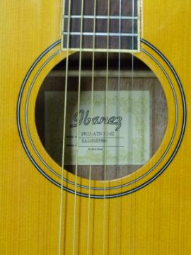 Ibanez acoustic guitar fitted with six steel string on individual tuning pegs