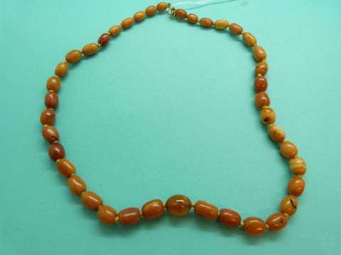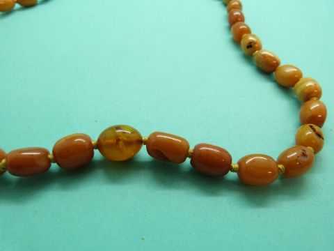An amber necklace made up of graduated ovel butterscotch coloured beads, 22g.