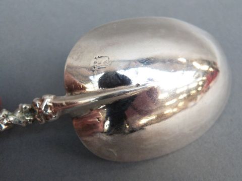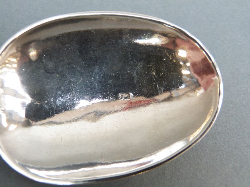 A possibly 18thC French white metal spoon topped by a huntsman, marked with a crowned M and also possibly an N (indistinct to rear of bowl) weight 45g, length 16cm