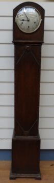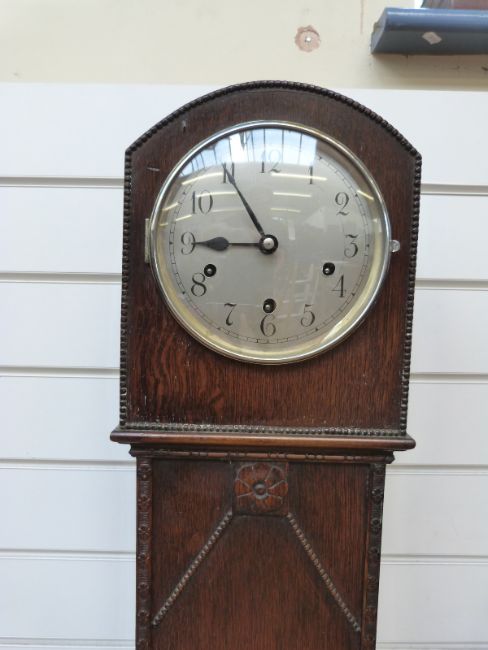 A c1930 oak granddaughter long cased clock with beaded decoration, silvered Arabic dial and Westminster chime three train movement