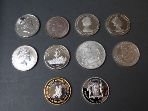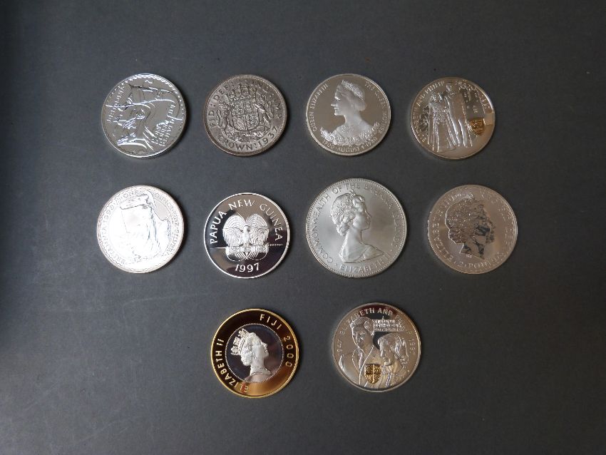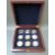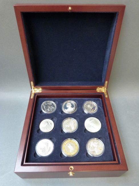 A deluxe wooden coin collector's chest containing three silver Britannia coins and six other crown sized coins etc some with silver content, nine coins in all