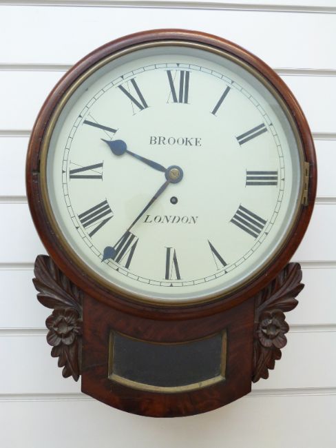 Brooke London late 19th century drop dial mahogany wall timepiece the Roman dial with spade hands, carved floral and foliate decoration, 30cm dial diameter