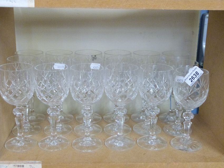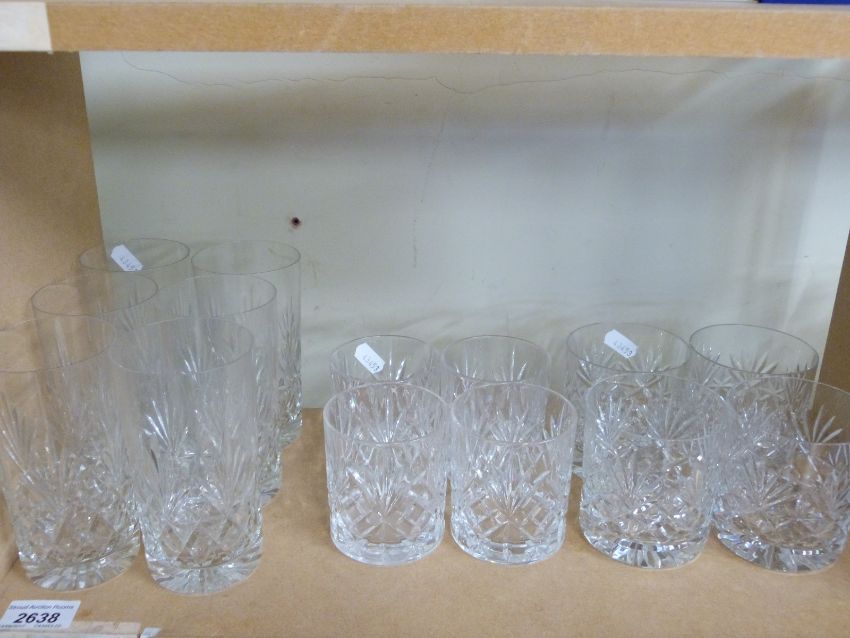 A collection of cut glass drinking glasses including eight whisky, six highball, six brandy, wine, hock, etc