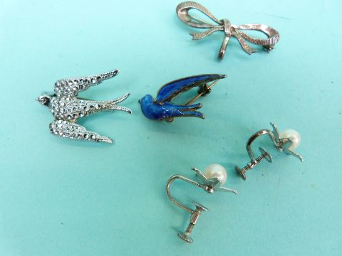 A collection of costume jewellery to include faux pearls, marcasite brooches, Norway silver brooch set with blue enamel in the form of a swallow, silver brooch, Tissot watch etc