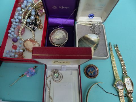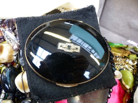 A collection of costume jewellery including silver necklaces, compact, shell necklaces, beaded necklaces etc