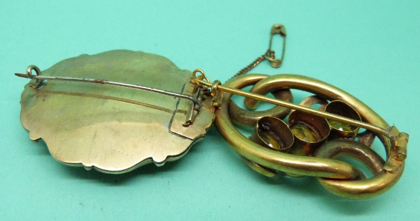 A Victorian brooch with a glass section to the centre and scrolling decoration and another Victorian brooch set with citrines