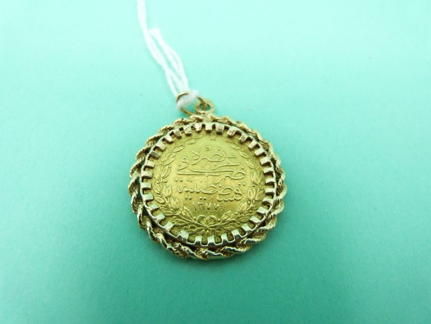 A Turkish 100 Kursh gold coin in yellow metal mount marked 14K, overall weight 9.75g