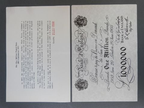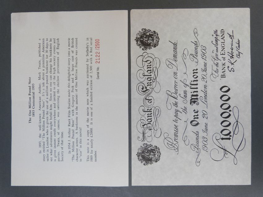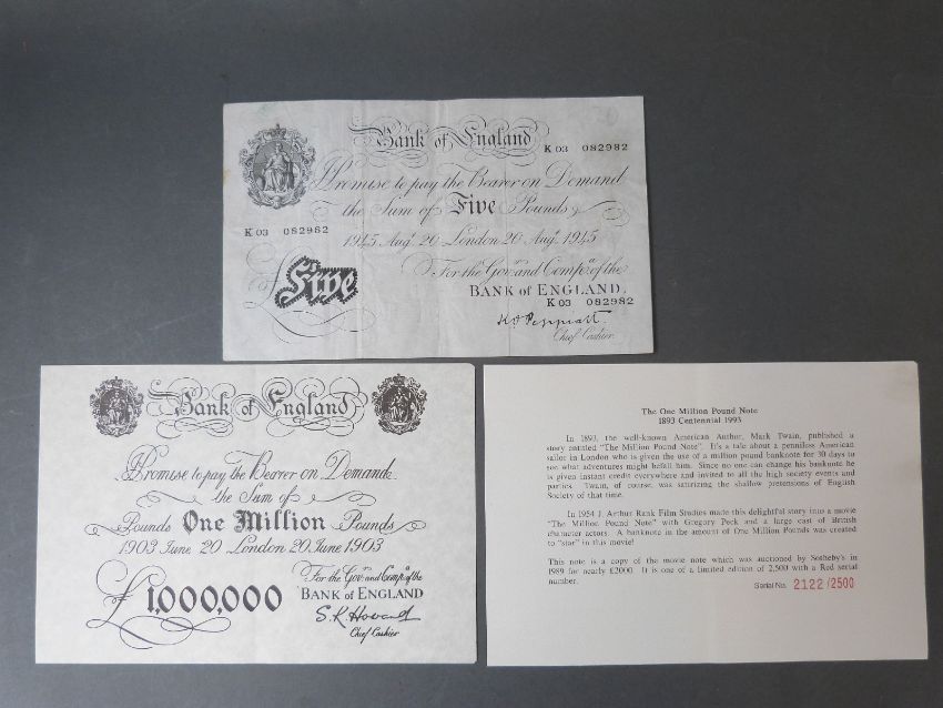 Peppiatt white five pound note, 1945 K03 082982 together with a replica one million pound note with certificate, and 'history' of the film the original was made for, serial no 2122/2500