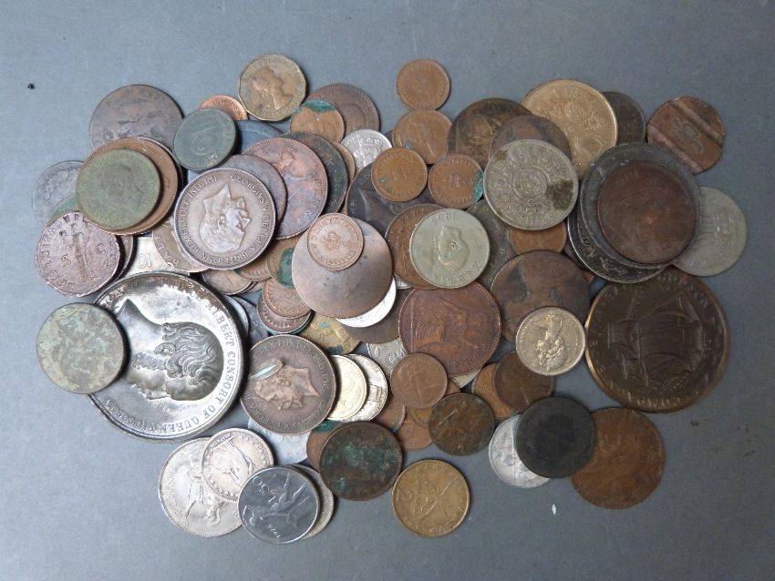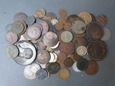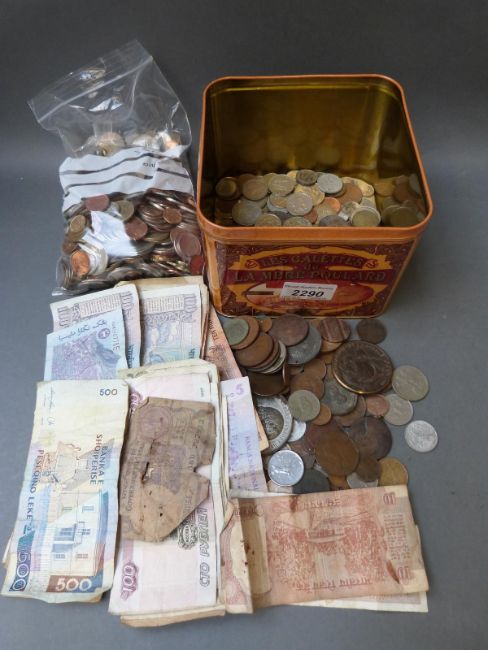 A tin containing an amateur coin collection, George II onwards, but largely world coins, 19thC up to present day Euros, very small silver content, together with Victorian medallion and a quantity of bank notes