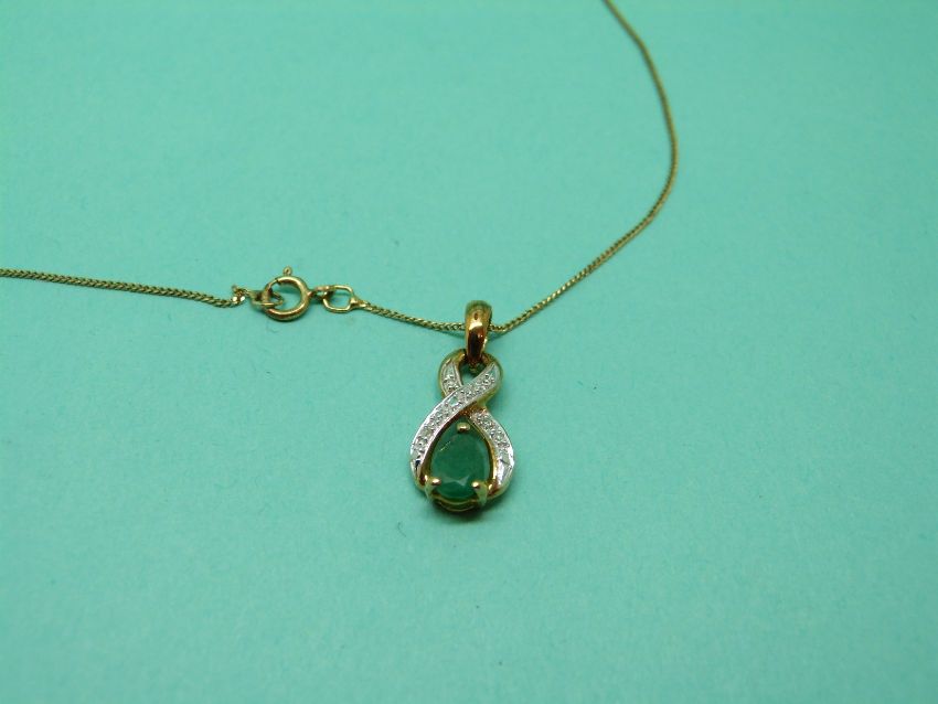 A 9ct gold chain and a 9ct gold pendant set with an emerald and diamonds