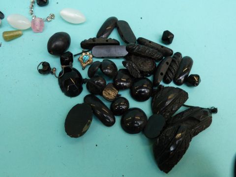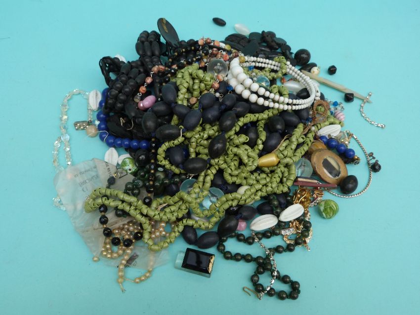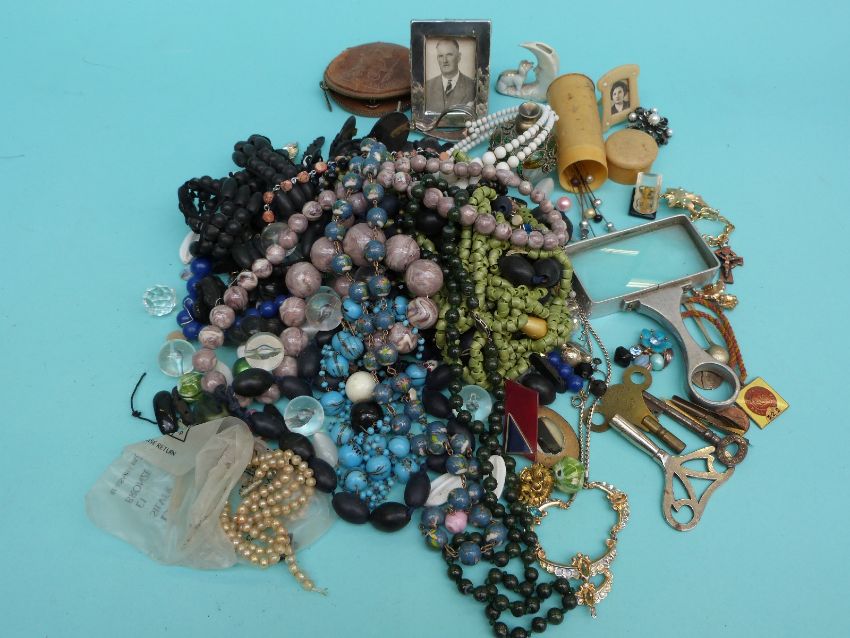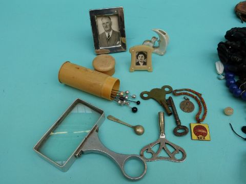 Costume jewellery including cloisonne necklace, jet, hallmarked silver photograph frame, a hallmarked silver pusher, pen nibs, 1930 Chepstow enamel horse racing badge etc.