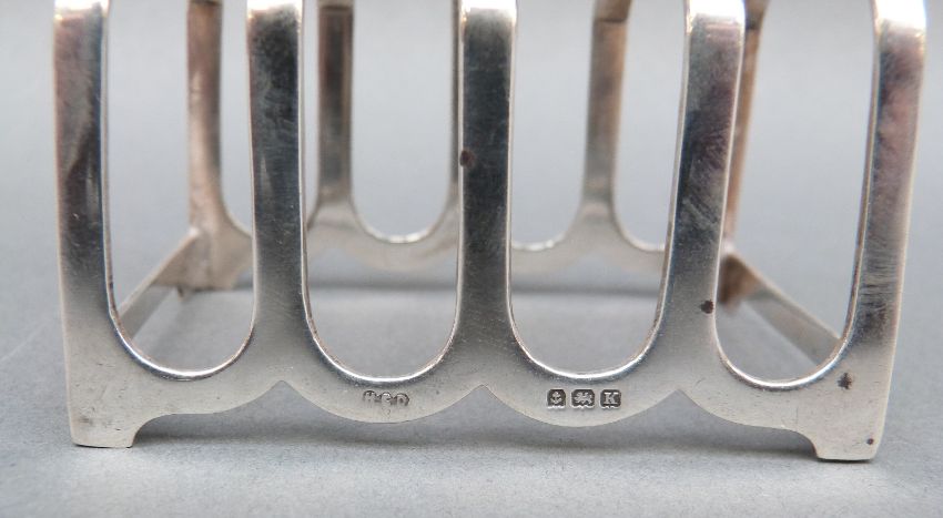 An Art Deco four slice hallmarked silver toast rack, Birmingham 1934 maker Henry Clifford Davis, also stamped Ogdens Harrogate & London, weight 45g, length 6.75cm
