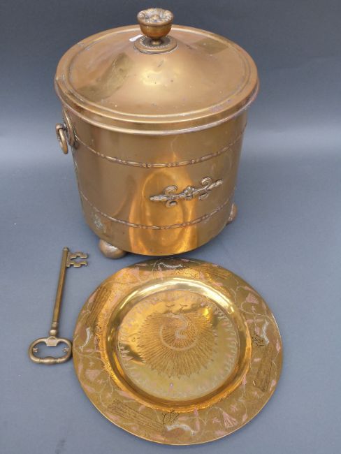 A quantity of copper and brassware to include copper watering can, brass key, cider measures, a case of plated cutlery, tools etc