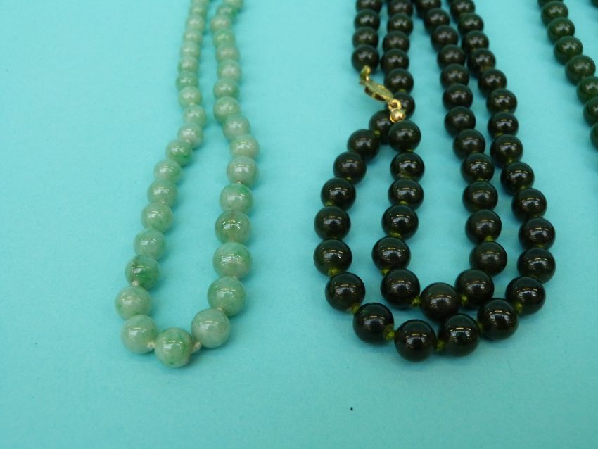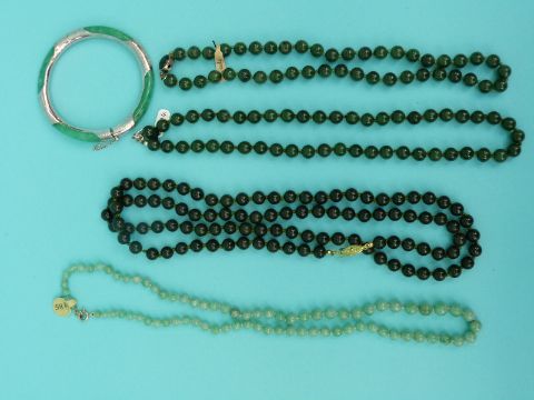 Four jade/ jadeite beaded necklaces and a silver and jadeite bangle