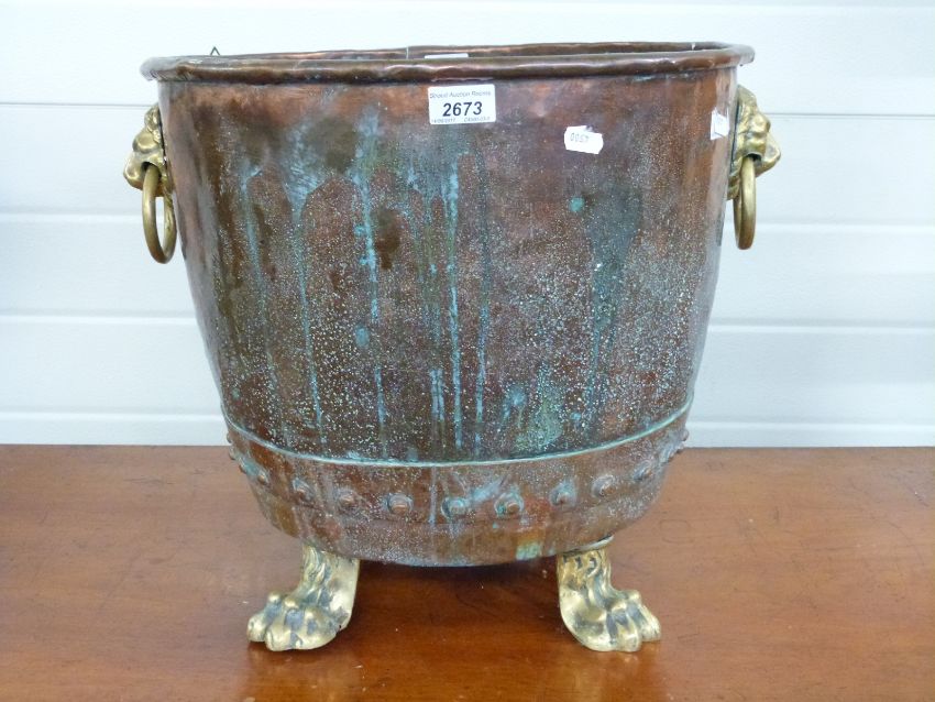 A Georgian riveted copper copper with looped lion mask handles, raised on paw feet, H40.5cm