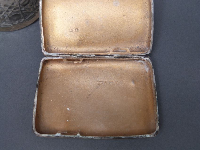 An Edward VII hallmarked silver topped hobnail cut globe shaped glass dressing table bottle, further hallmarked silver lidded dressing table pot and a hallmarked silver cigarette case, weight 63g