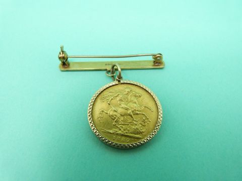 An 1887 Jubilee head gold full sovereign mounted as a brooch, on a 9ct gold bar, weight 11.7g