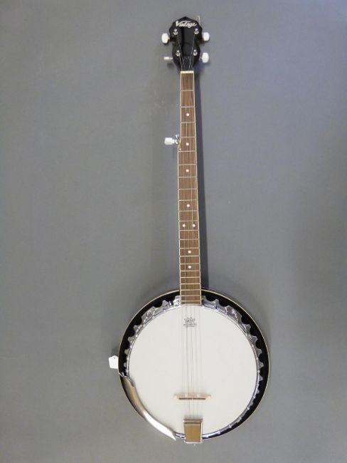 A 5 string banjo by Vintage, with 'Remo' head made in Italy, soft carry case and leather shoulder strap