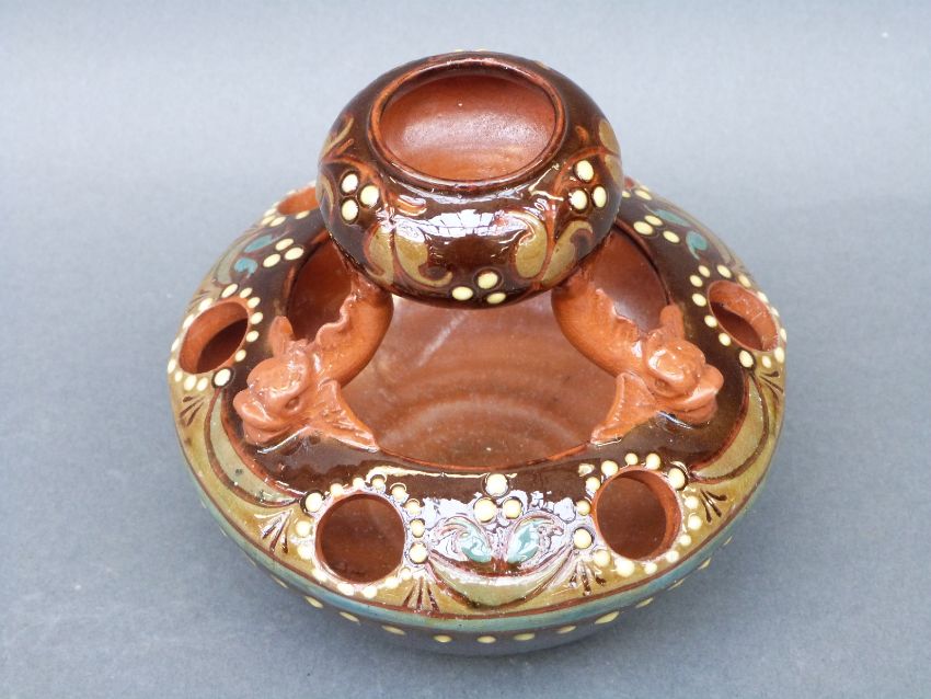 A CH Brannam pottery flower stand/jardiniere with fish supports, impressed marks for William Brannam, 12cm tall
