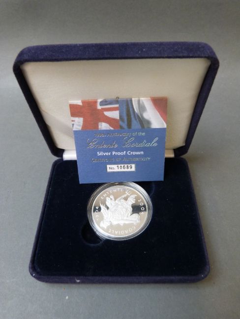 A cased silver proof crown 2004 "Entente Cordiale" with certificate 10689, together with a London Mint Office "Changing Face of Britain's Coinage" silver medal coin, cased with certificate and two other modern crowns
