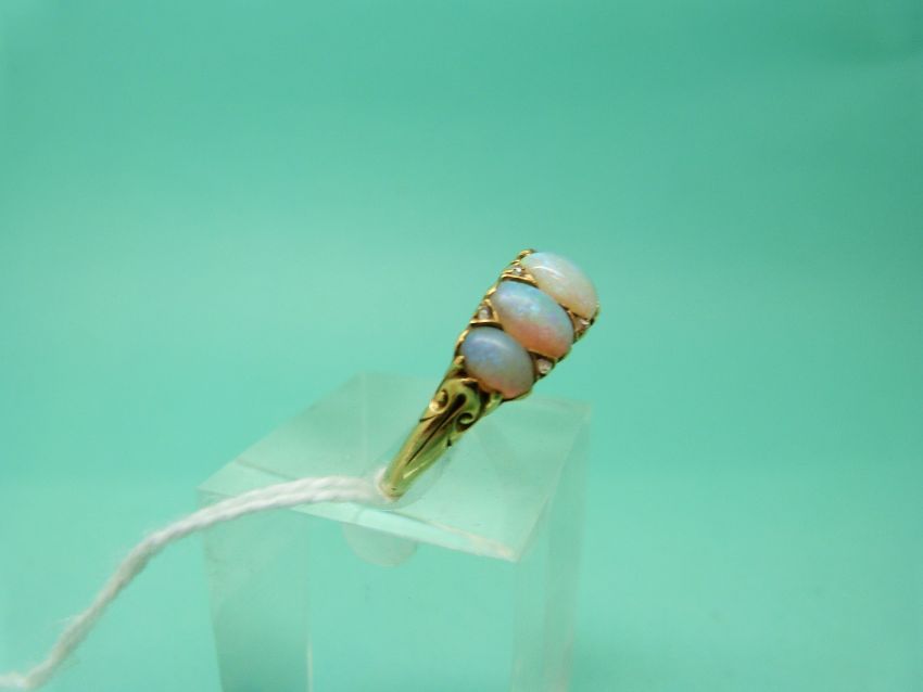An 18ct gold ring set with five opal cabochons and diamonds, Birmingham 1888 (Size N)