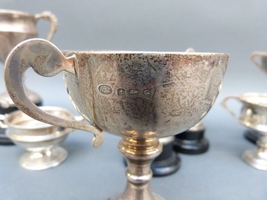 Seven various hallmarked silver twin handled trophy cups, height of largest 9.5cm, some on bases