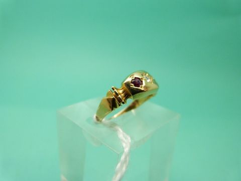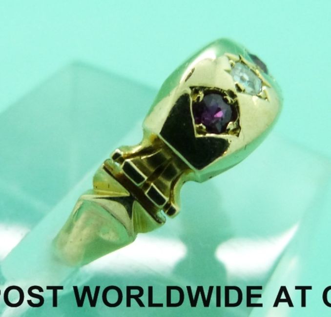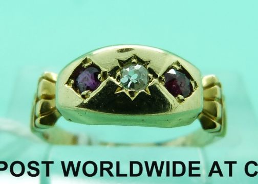 An 18ct gold ring set with a diamond and two rubies (Size J)