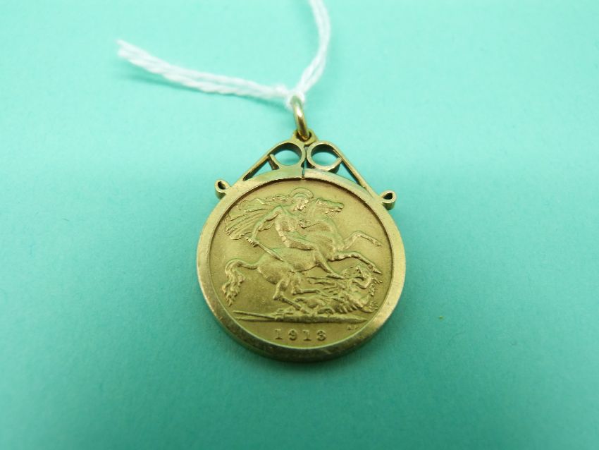 An 1913 gold half sovereign in a 9ct gold clip mount, weight 5g