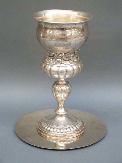 A German white metal communion cup with embossed decoration and gilt wash interior, height 20.5cm with marks to lower rim, together with a platter, diameter 16.5cm, weight of both 334g