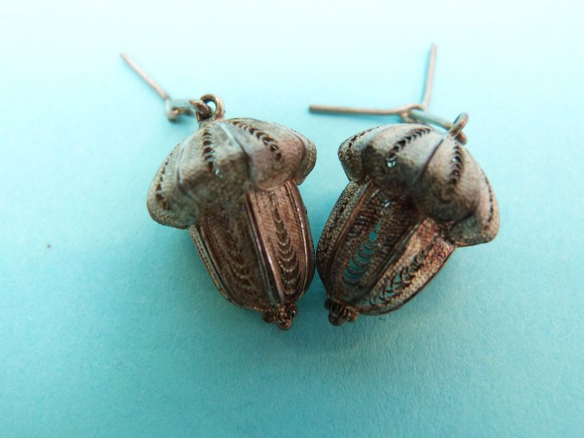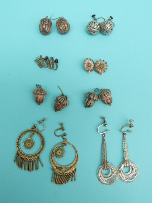 Eight pairs of white metal filigree earrings including flowers, spheres, hoops and two in the form of acorns