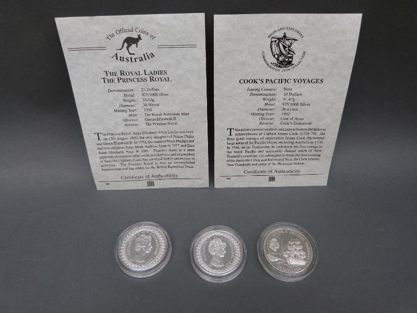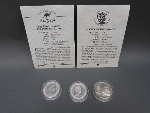 Two Australian silver 25 dollar coins and a Cook's Pacific Voyages 10 dollar example, 38.61 diameter, some with certificates