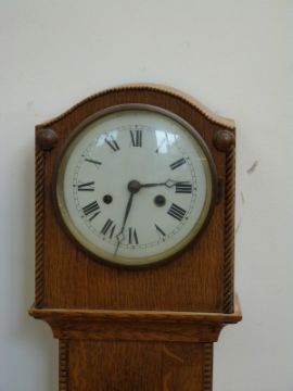 A c1930 light oak cased granddaughter long cased clock with beaded carved decoration, two train movement, enamelled Roman dial and pierced hands, 132cm tall